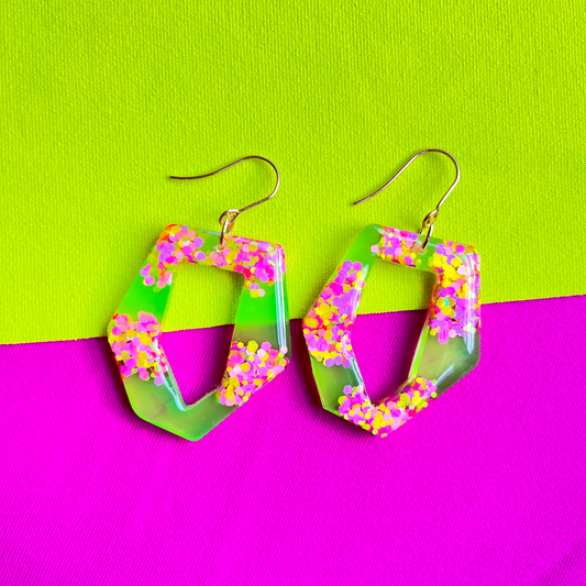Green, Magenta & Purple Glitter Hexagon Dangle Earrings for Sensitive Ears