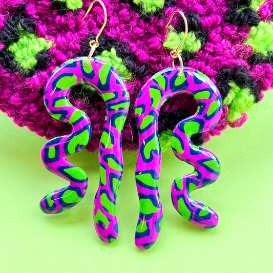 Fuchsia and Green Animal Print Squiggle Dangle Earrings for Sensitive Ears