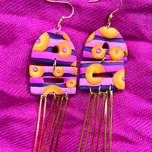 Bright Pink, Orange & Purple Clay Scalloped Arch Dangle Earrings for Sensitive Ears